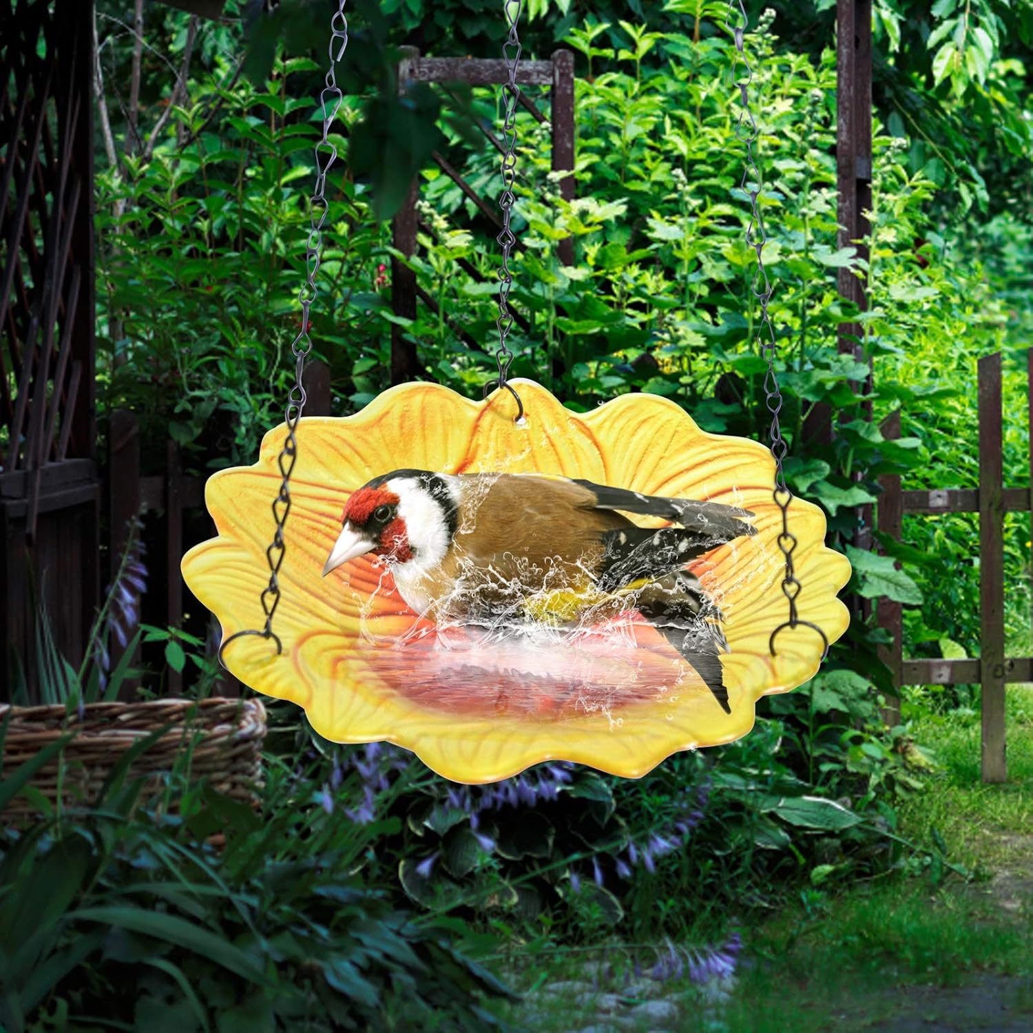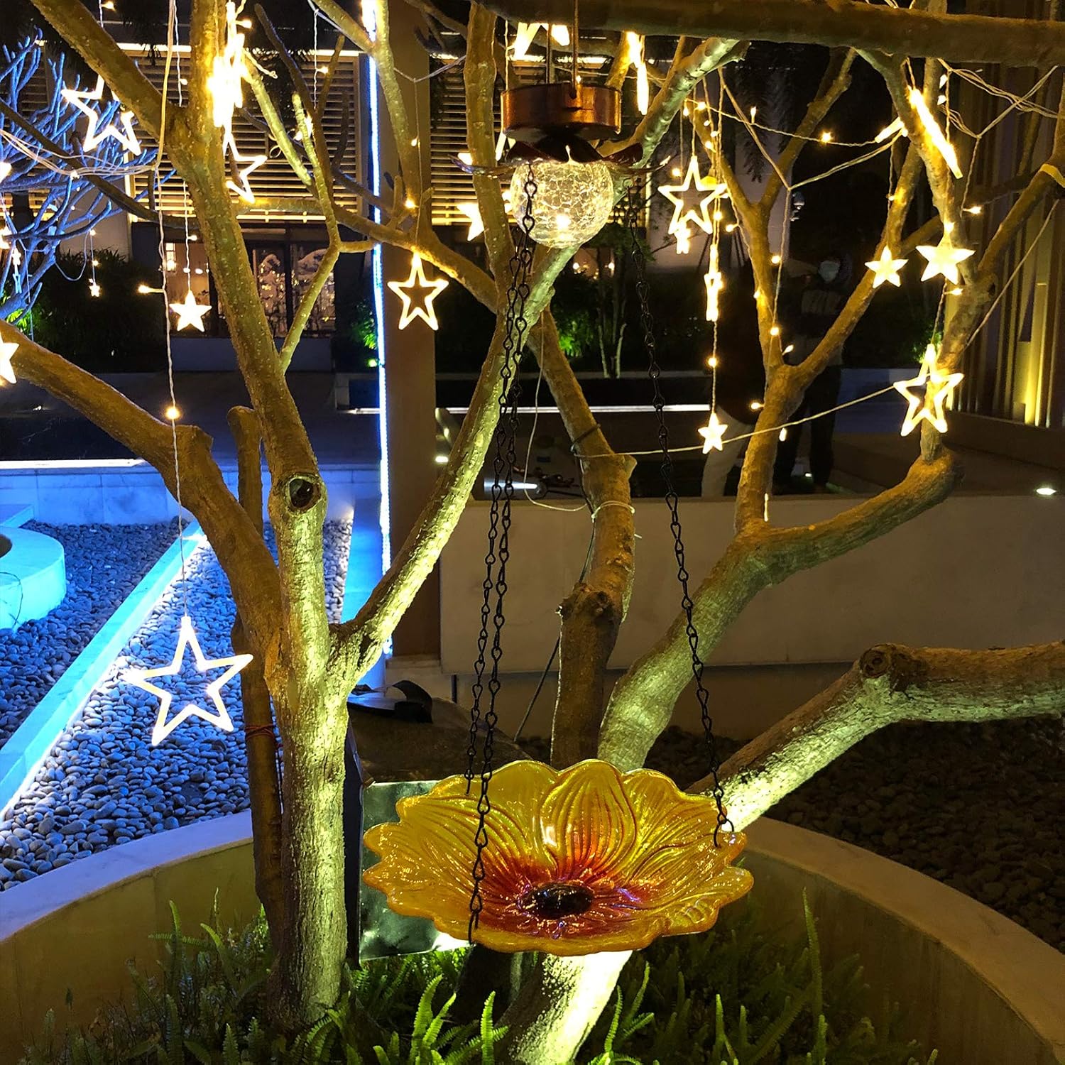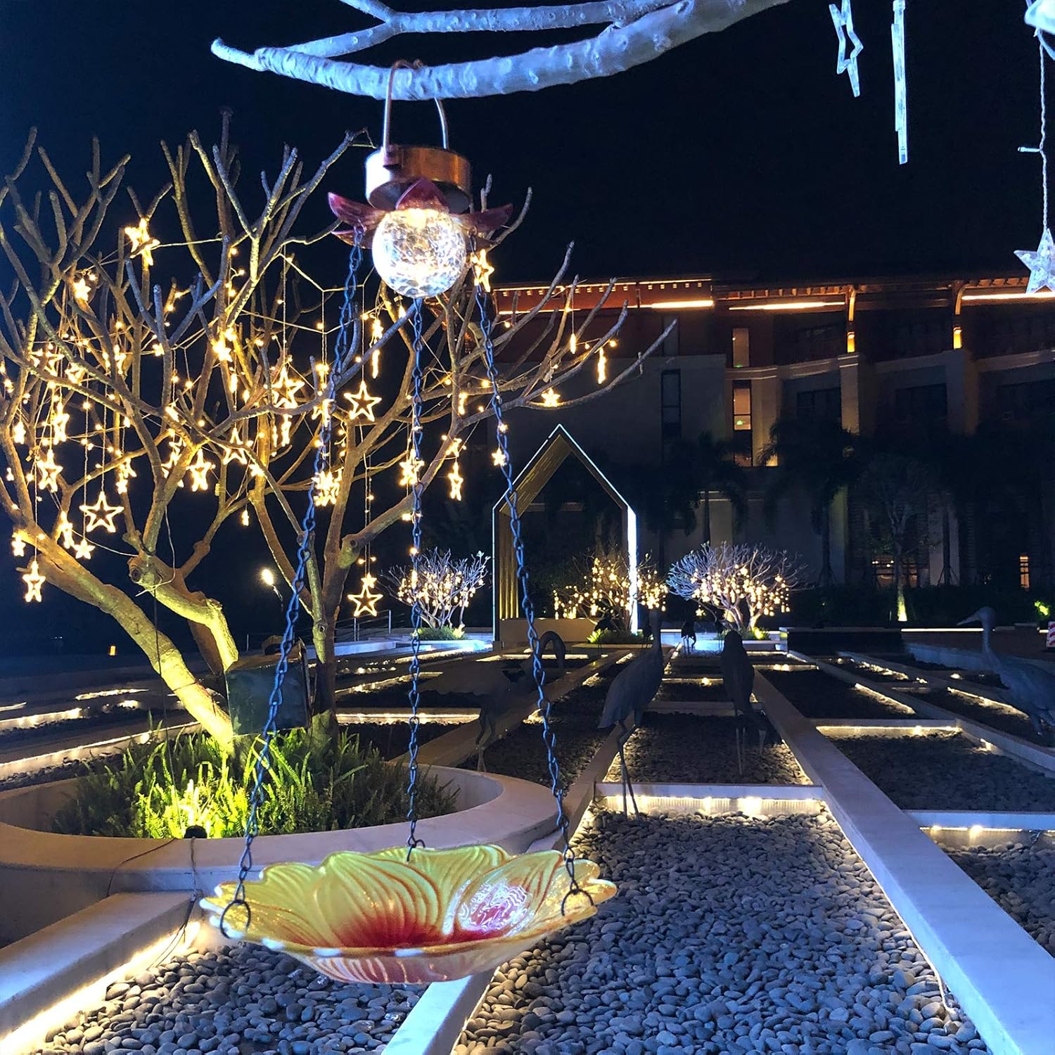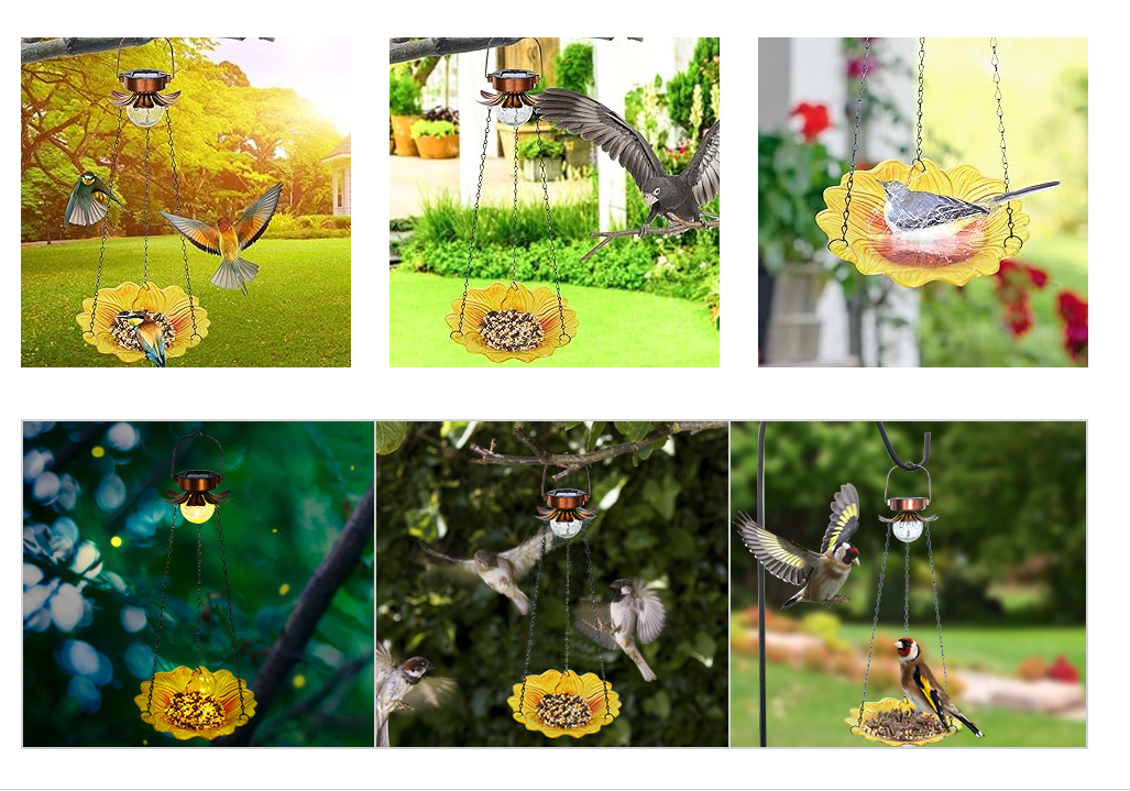 1 | 【Pretty and Function Bath or Feeder】The tray is the shape of a sunflower and the yellow light is designed with cracked glass like a beautiful crystal ball, providing warm light and a romantic atmosphere for your yard. It is not only a hanging bird feeder for outside but also a solar garden light decoration. |